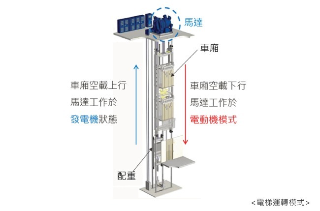 電梯的結構均有配重塊的設計,大部份的使用情況為輕載,車廂上下樓的方向大致可分為二類,上樓時,馬達工作於電動機模式;下樓時,馬達工作於發電機模式。